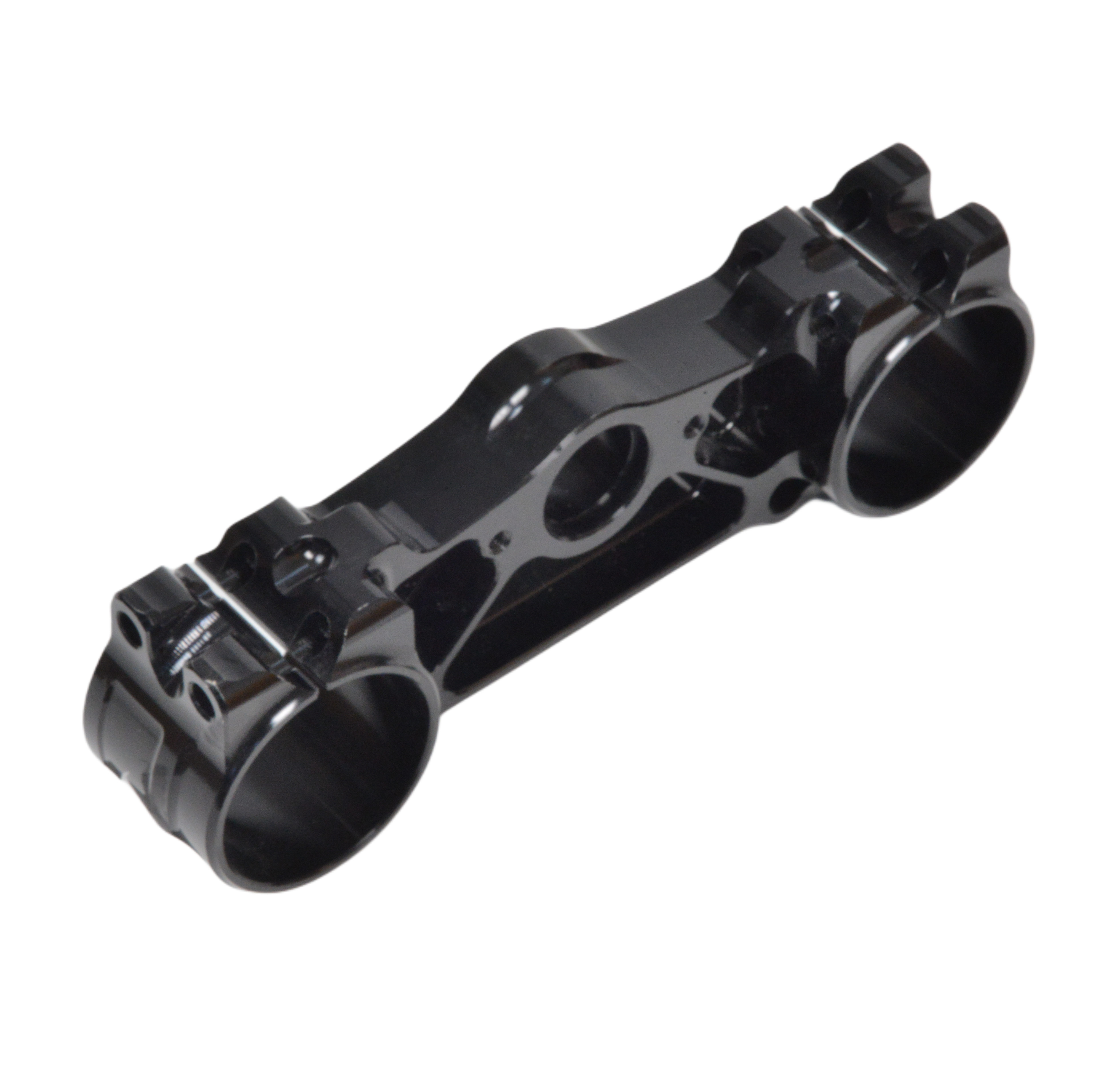 Нижняя траверса (нижний зажим вилки) представляет собой высококачественную деталь, предназначенную для фиксации перьев передней вилки на мотоциклах моделей FX250, FX300 и FX400. Это ключевой элемент подвески, обеспечивающий стабильность и точность управления, особенно в условиях бездорожья или эндуро. Траверса выполнена в черном анодированном цвете, что придает ей матовый, устойчивый к коррозии и износу вид. Она имеет симметричную форму в виде горизонтальной балки с двумя цилиндрическими зажимами (хомутами) на концах. Каждый зажим оснащен разрезом для удобной установки и фиксации перьев вилки с помощью болтов (на фото видны пазы для затяжки). Центральная часть траверсы слегка утолщена для повышения прочности, с крупным круглым отверстием в середине для прохода штока рулевой колонки. По бокам от центра расположены дополнительные монтажные отверстия и выемки для крепления других элементов подвески, таких как защитные кожухи или датчики. Общая длина траверсы указана на фото. Изготовлена из легкого, но прочного алюминиевого сплава, что минимизирует вес без потери жесткости. Это делает ее идеальной для мотокросса или эндуро, где важна балансировка и сопротивление ударам. Траверса устойчива к деформациям. Совместимость и применение: Подходит для мотоциклов FX250, FX300 и FX400 (возможно, аналогичных серий, таких как YX300 или подобных, на основе общих стандартов). Устанавливается в нижней части передней вилки, соединяя ее с рамой и обеспечивая синхронное движение перьев. Рекомендуется для замены оригинальной детали при тюнинге, ремонте или после повреждений. Для установки требуется стандартный набор инструментов (торцевые ключи, динамометрический ключ для правильной затяжки болтов).